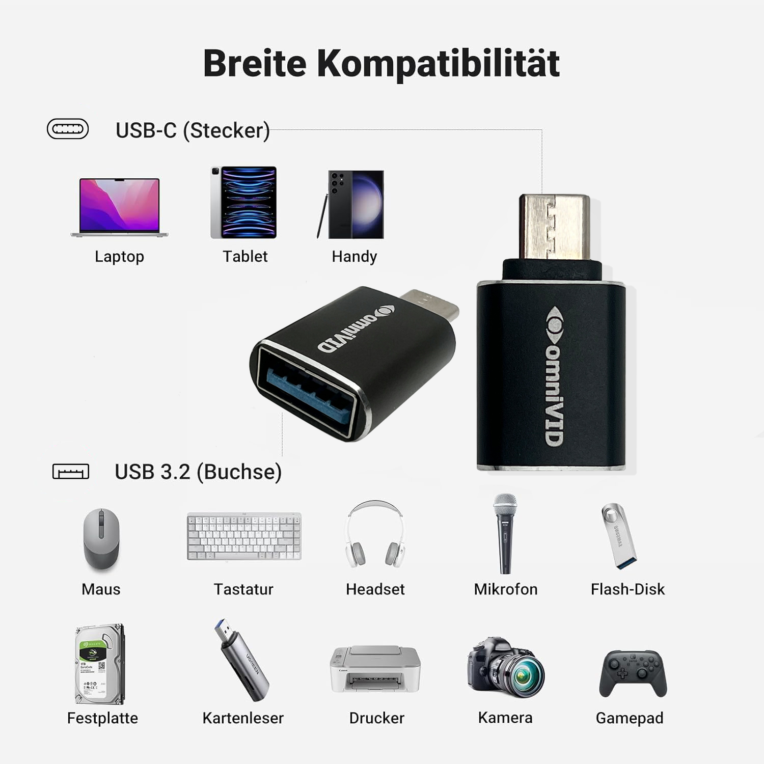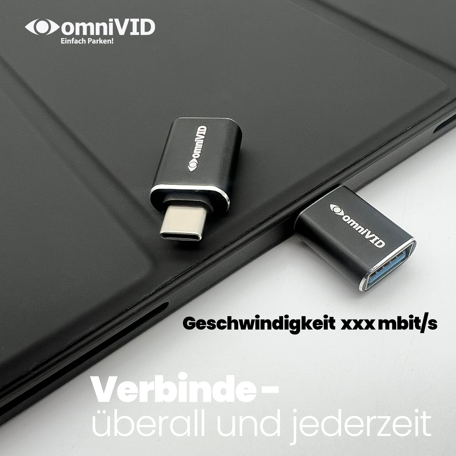 omniVID® Adapter USB-A auf USB-C für volle Kompatibilität. — Einfach verbinden. Alles passt.