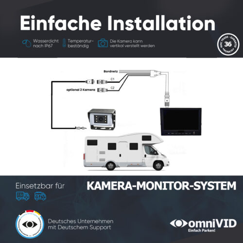 Das leistungsstarke System mit der hochauflösenden Kamera , im IP69k-Schutzgehäuse mit 12-24 Volt und dem bewährten 7“ EXKLUSIVE Monitor wurde insbesondere für den Einsatz an Nutzfahrzeugen und Wohnmobilen entwickelt.