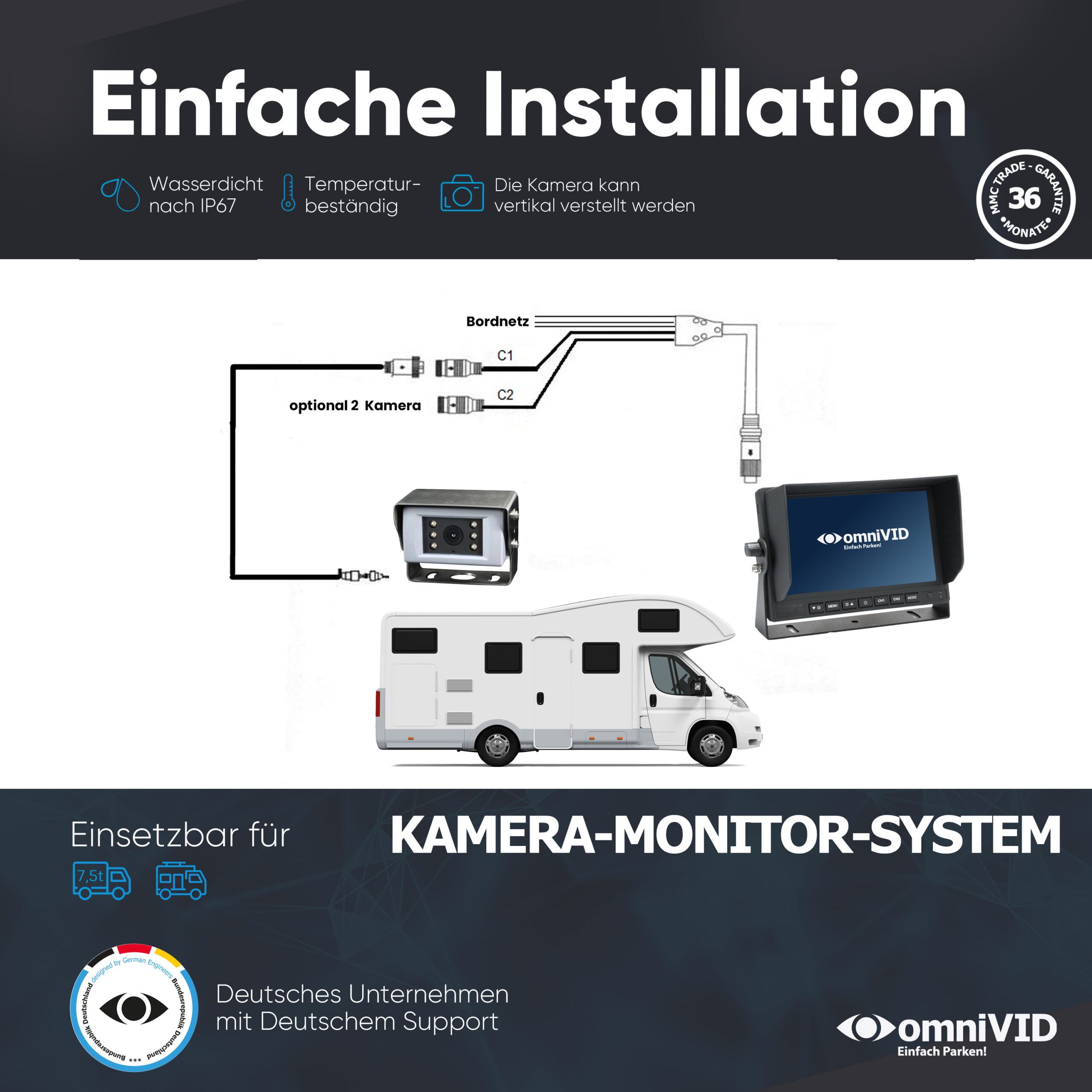 Das leistungsstarke System mit der hochauflösenden Kamera , im IP68-Schutzgehäuse mit 12-24 Volt und dem bewährten 7“ EXKLUSIVE Monitor wurde insbesondere für den Einsatz an Nutzfahrzeugen und Wohnmobilen entwickelt.